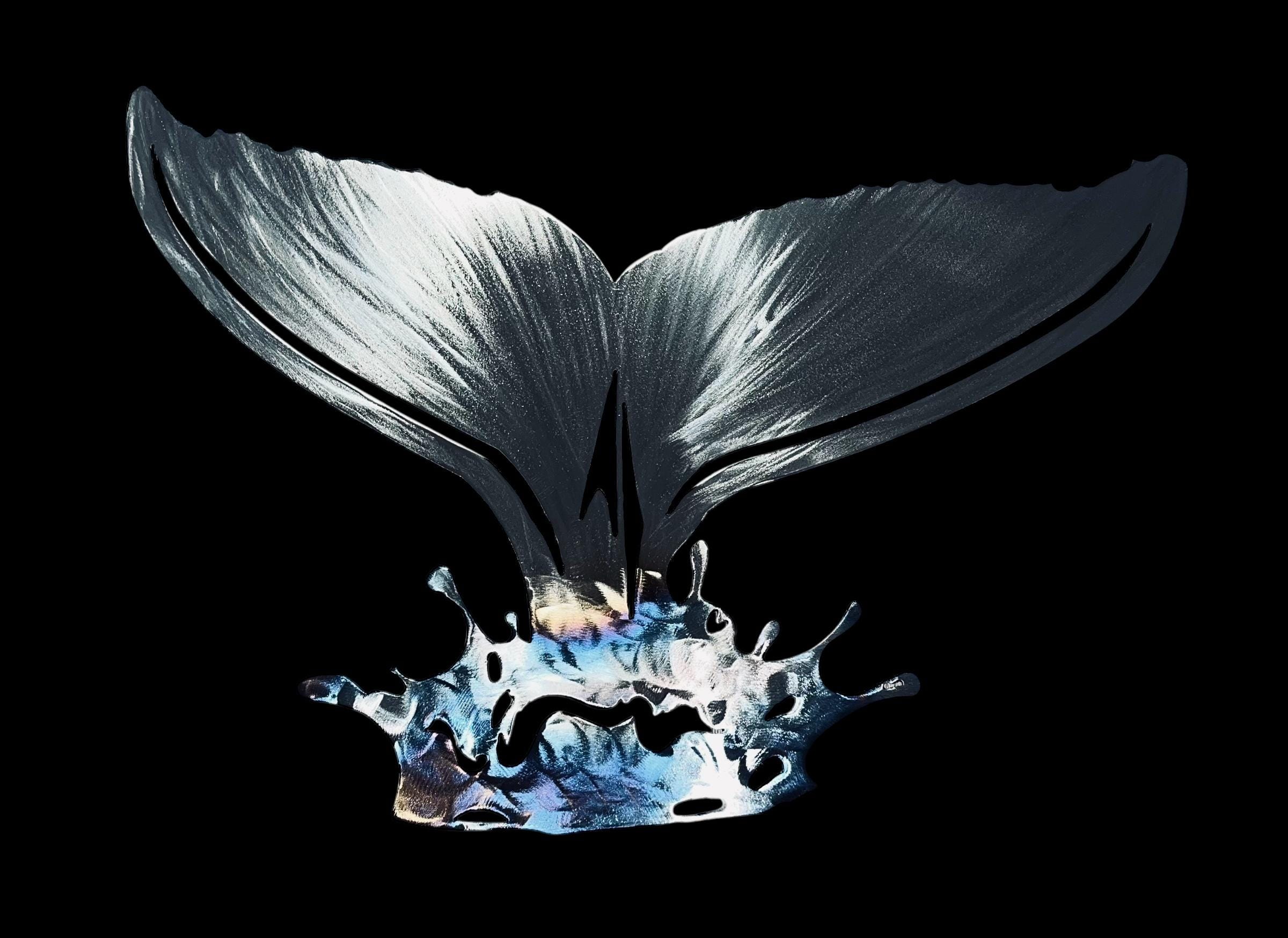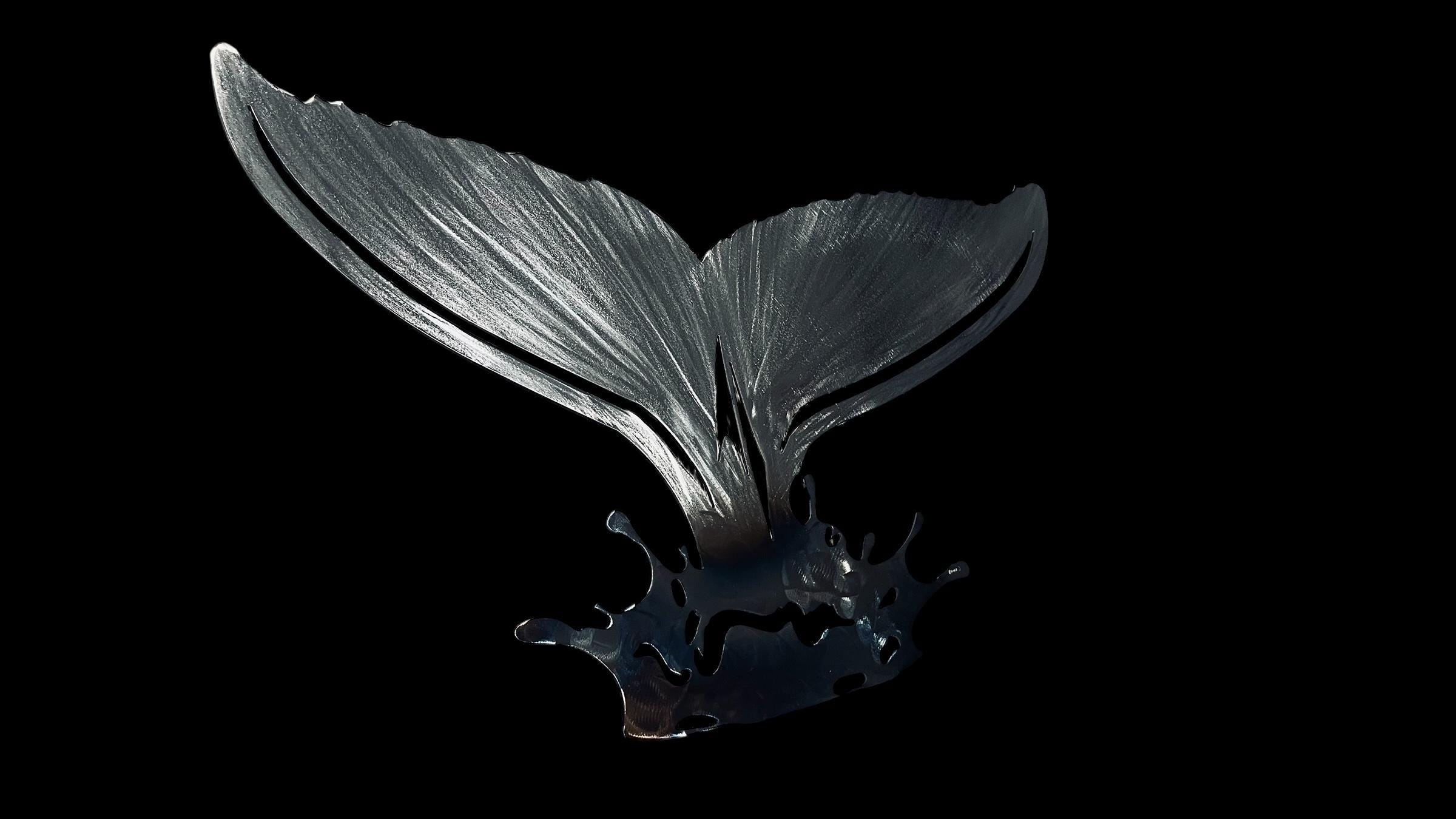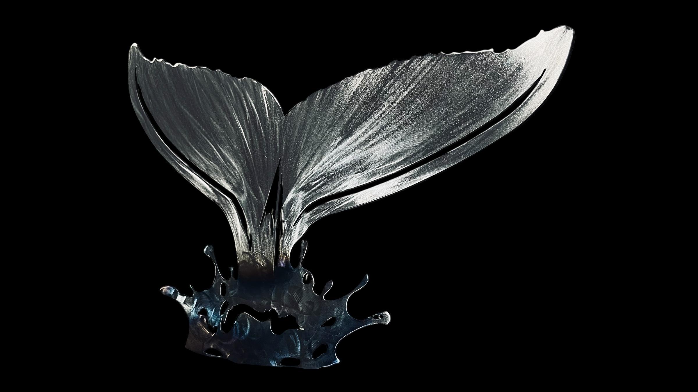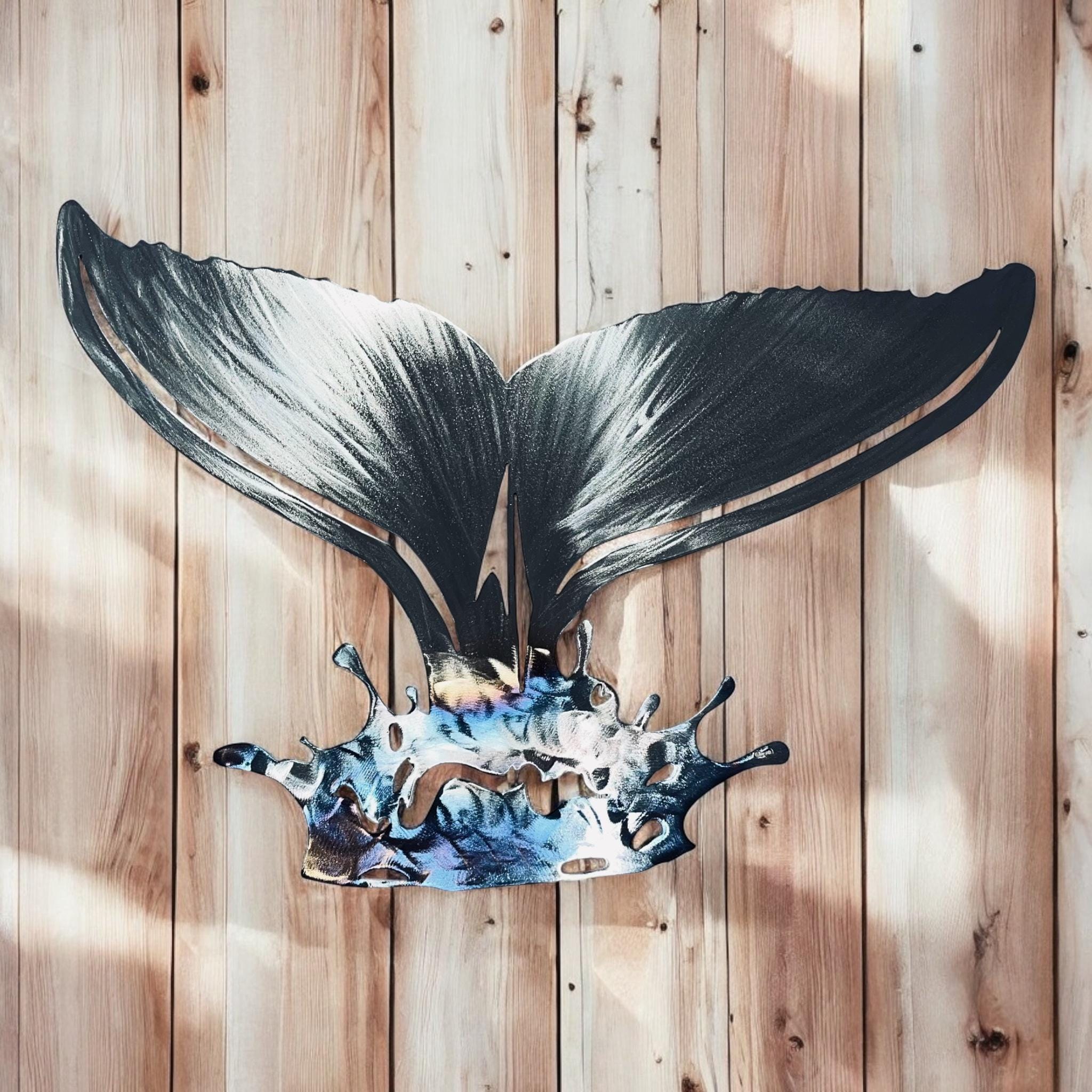 16 gauge steel, torched water for a blueish color, grinded tail for texture, clear coated.